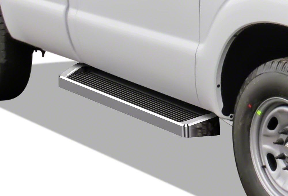Construction and Features. Crafted from high-quality materials, these running boards boast a polished chrome finish that resists corrosion while adding a sleek and professional look to your truck. Furthermore, the wide 6-inch step width ensures secure footing for safe entry and exit, while the fixed step design enhances stability and durability.