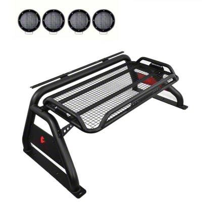 Included Lighting. Made for the Ford F-250 Super Duty models, this Roll Bar comes in a matte black finish. Built to carry up to 150 pounds of cargo on its basket while protecting the rear of your cab area, this roll bar includes a built-in third brake light and has 4 5.30 inch black round flood lights for additional auxiliary lighting during your off-road adventures.