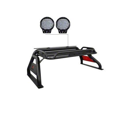 Versatile Roll Bar. Elevate your F-250 Super Duty's utility and style with the Atlas Roll Bar, featuring 9-Inch Black Round Flood LED Lights and an integrated basket. Constructed from black powder-coated 3-inch steel round tubes, this roll bar is designed for durability and resistance to the elements.