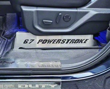 Application. This Brushed Lower Seat Vanity Plate with 6.7 Powerstroke Logo fits 2017-2022 Ford F-250 Super Duty models.