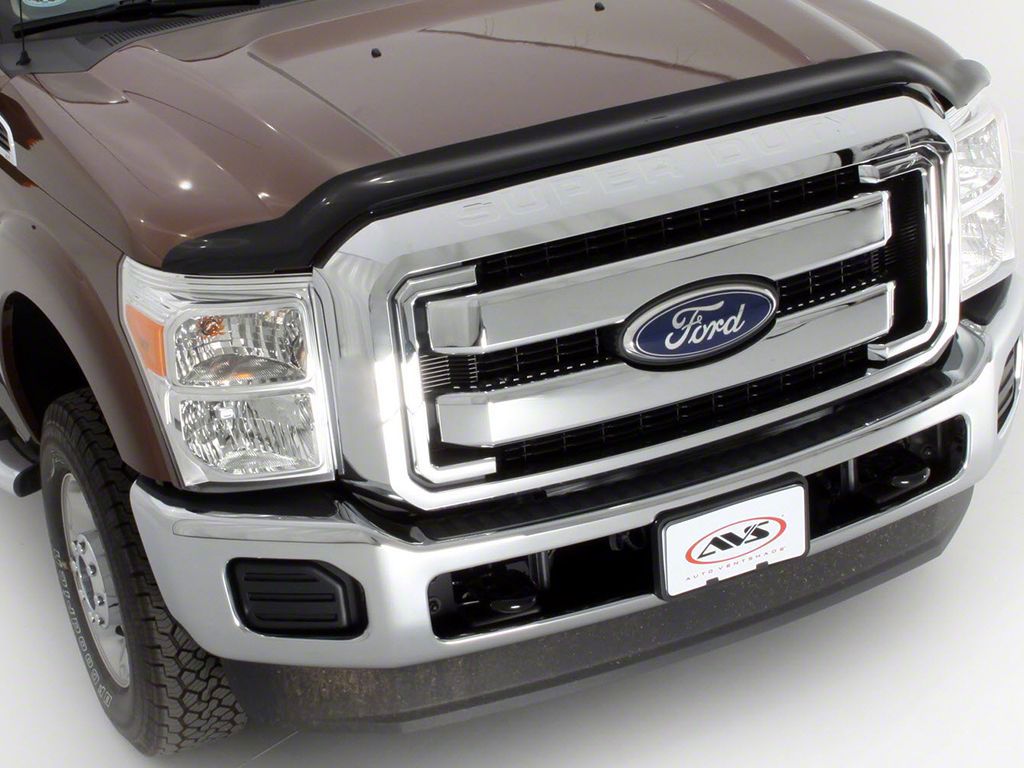 Stylish Hood Protection. The Bugflector II Hood Shield in dark smoke offers a sleek solution for protecting your vehicle's hood from bugs, debris, and small stones. Its aerodynamic design ensures minimal drag while effectively deflecting unwanted road elements away from your vehicle. The dark smoke finish adds a stylish touch that complements the rugged look of your F-250 Super Duty.