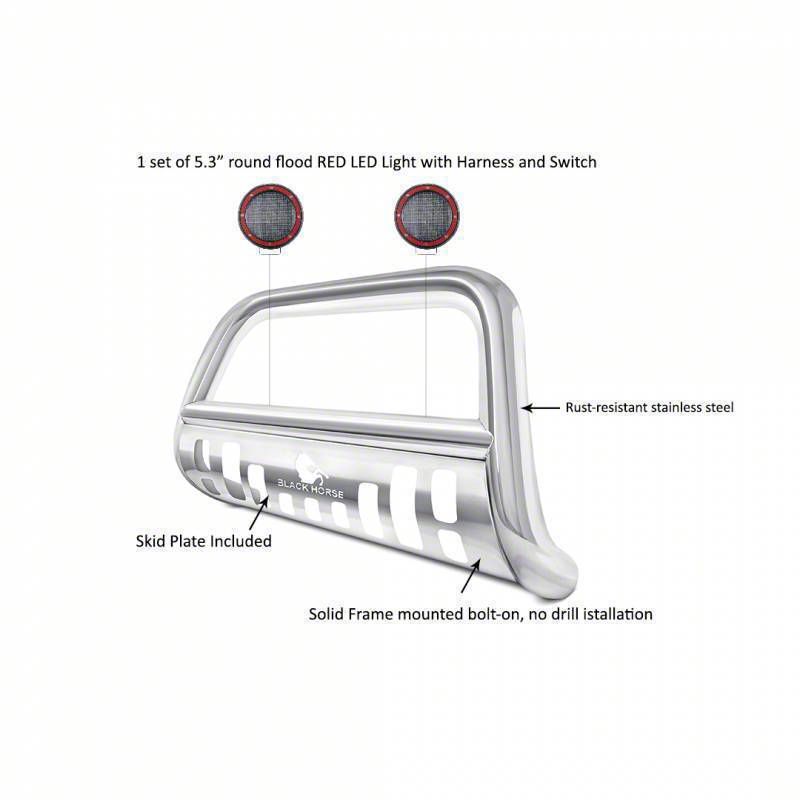 Black Horse Off Road Bull Bar Kit Stainless Steel Stainless Steel Skid Plate Pair of 5.3" Dia. LED Flood Lights w/ Red Trim Rings Wiring Harness and Switch