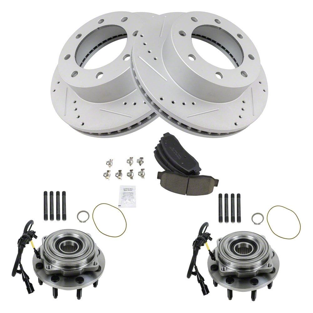 Heavy-Duty Front Brake and Bearing Upgrade. The Ceramic Performance 8-Lug Brake Rotor, Pad and Wheel Bearing Kit offers a full-service front-end upgrade for 4WD F-250 Super Duty trucks. Engineered for demanding applications like towing and hauling, this kit improves braking power, reduces noise and dust, and refreshes critical front suspension components in one comprehensive package.