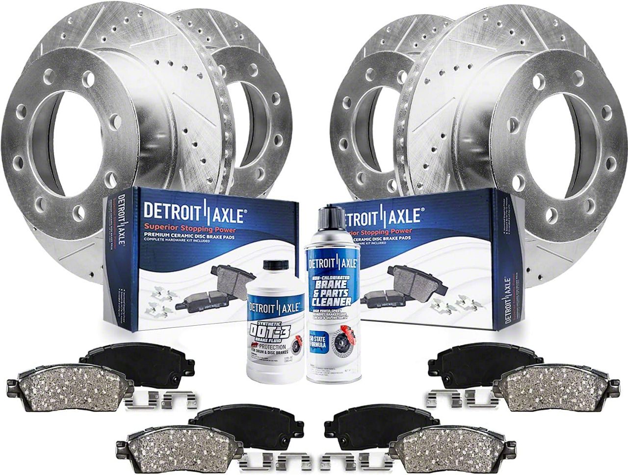Kit Includes: (2) Front Drilled and Slotted Brake Rotor + (2) Rear Drilled and Slotted Brake Rotor + (2) Front Ceramic Brake Pad + (2) Rear Ceramic Brake Pad + (2) Brake Fluid & Cleaner