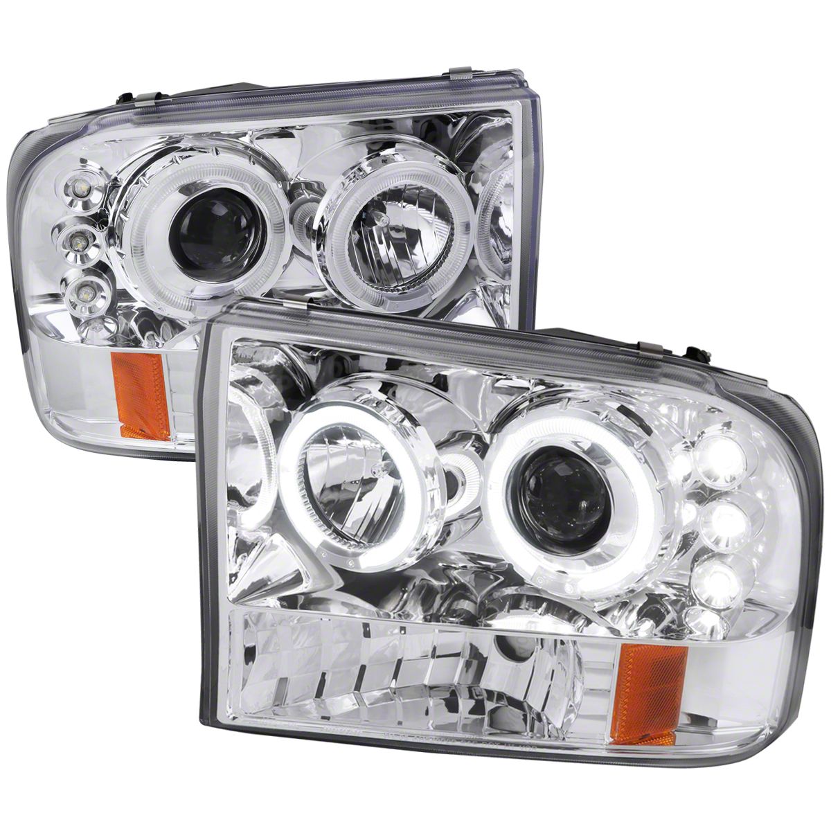 Application. The Dual Halo Projector Headlights; Chrome Housing; Clear Lens fit 1999-2004 F-250 Super Duty models.