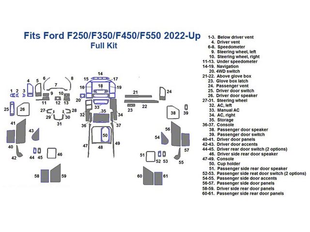 Application. This Full Dash Trim Kit fits 2022-2026 F-250 Super Duty.
