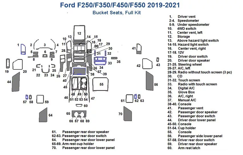 Application. This Full Dash Trim Kit; Carbon Fiber Finish fits all 2019-2021 F-250 Super Duty with Bench Seats models.