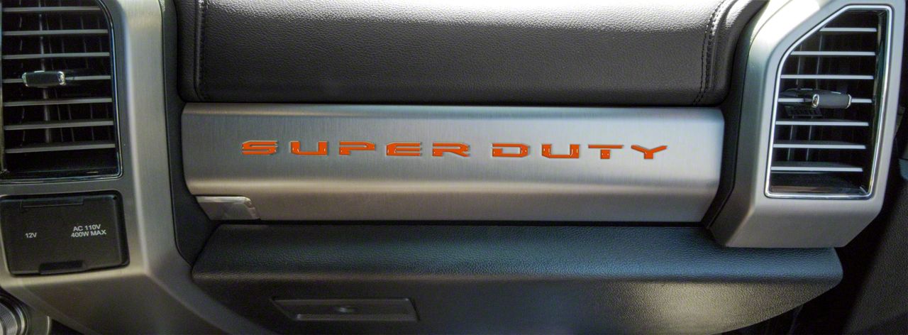 Quick Interior Enhancement. Looking to personalize your Ford F-250 Super Duty's interior? Look no further than this exceptional Glove Box Insert Letters in Gloss Orange. This 10-piece kit is easy to install and requires no cutting or drilling. This means you can elevate your car’s interior in a quick and extremely easy manner. No need for even a single sweat to drop.