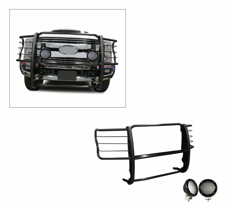 Application. The Grille Guard with 5.30-Inch Black Round Flood LED Lights fit 2017-2022 F-250 Super Duty.