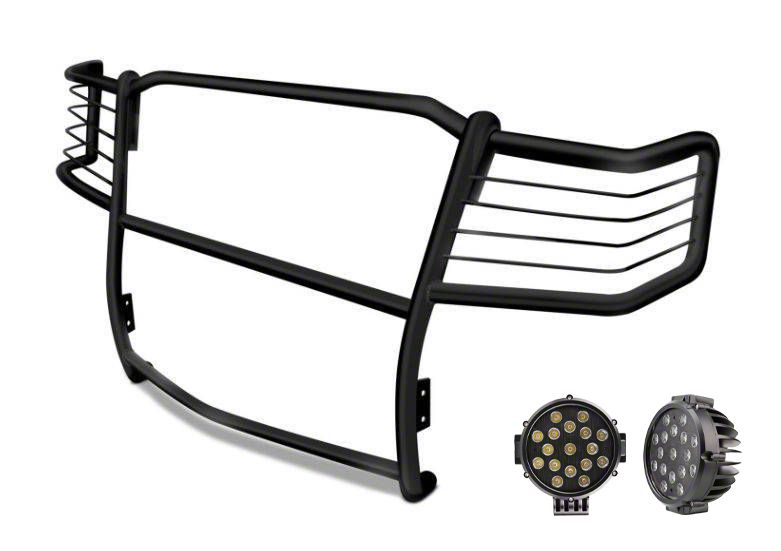 Enhanced Protection and Style. The Grille Guard with 7-Inch Black Round LED Lights provides additional protection for your vehicle while enhancing its exterior styling. This product features removable wings/brush guards and includes pre-drilled mounting tabs for auxiliary lighting, making it a versatile addition to your Ford F-250 Super Duty.