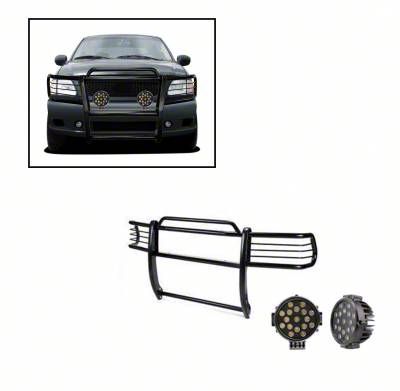 Safer Driving Experience. This Grille Guard doesn't just protect; it illuminates the path ahead. Integrated seamlessly into its robust design are a pair of powerful 7-inch black round LED lights, designed to enhance visibility and improve safety in any driving condition. These high-intensity LEDs produce a significantly brighter and more focused beam of light compared to traditional halogen bulbs, cutting through darkness and illuminating the road ahead with exceptional clarity.