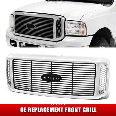 Application. The Horizontal Slat Style Upper Replacement Grille; Chrome with Black Slats fits 2005-2007 F-250 Super Duty models.