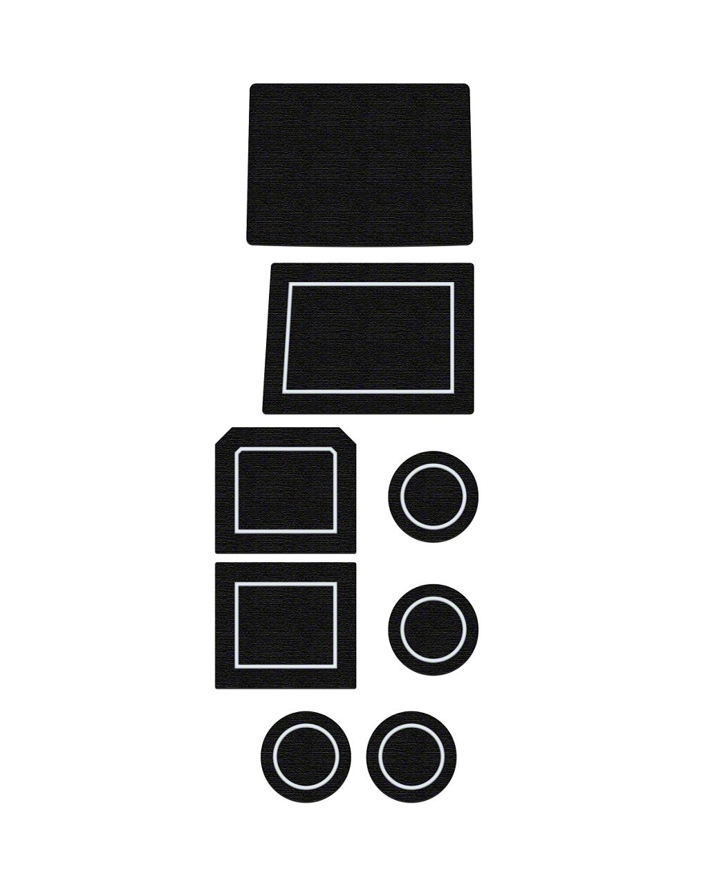 Construction and Appearance. Crafted from durable, non-absorbent foam, these inserts feature a dual-layered, noise-reducing design that stays in place and resists wear. The black finish with white accents adds subtle style while blending seamlessly with your factory interior. Optional peel-and-stick backing ensures a secure fit without permanent modification.