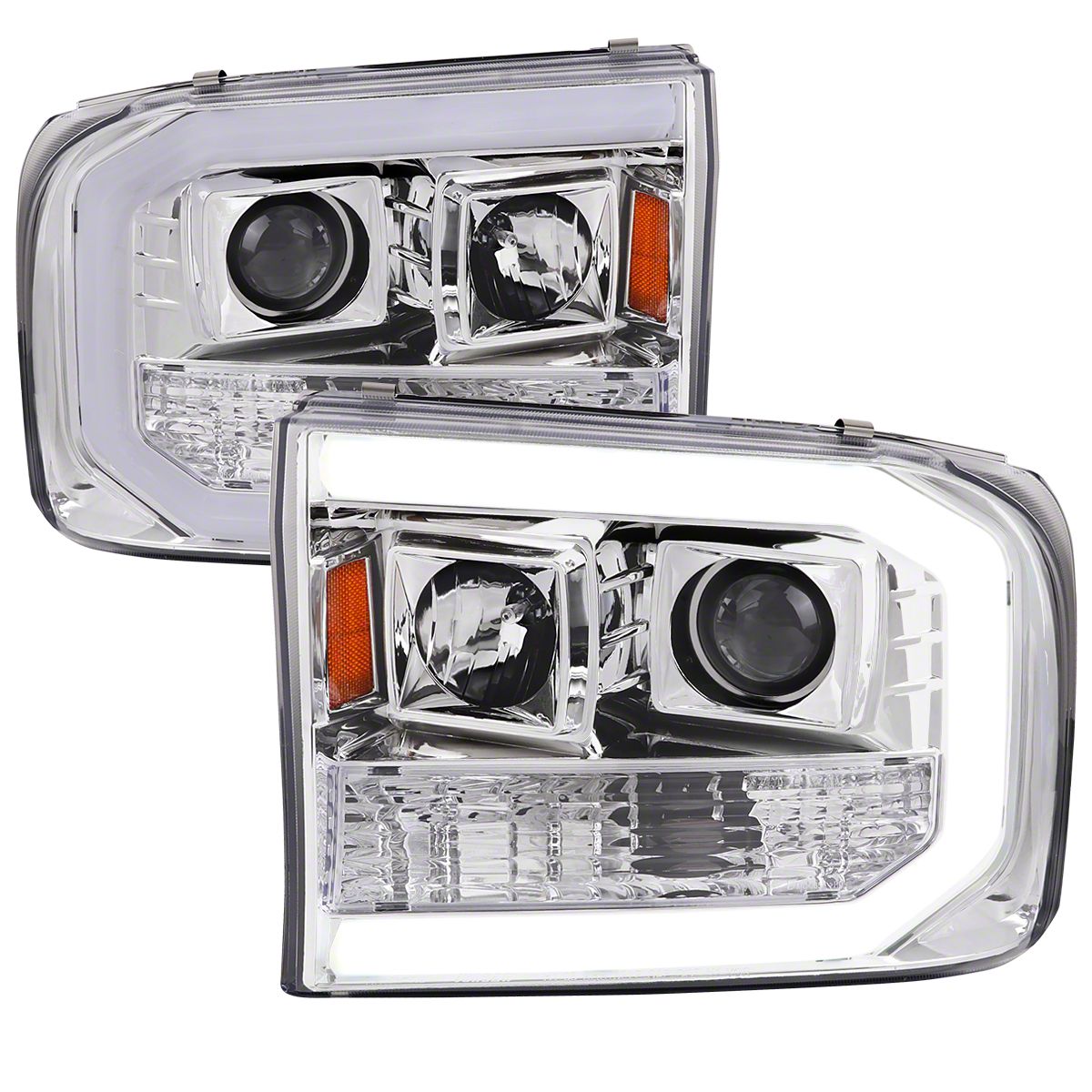 Application. The LED Bar Projector Headlights; Chrome Housing; Clear Lens fit 1999-2004 F-250 Super Duty models.