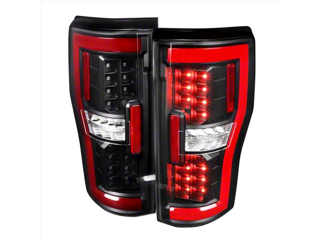 Application. The LED Bar Tail Lights; Matte Black Housing; Clear Lens fits 2017-2019 F-250 Super Duty with Factory Halogen Non-BLIS Tail Lights.