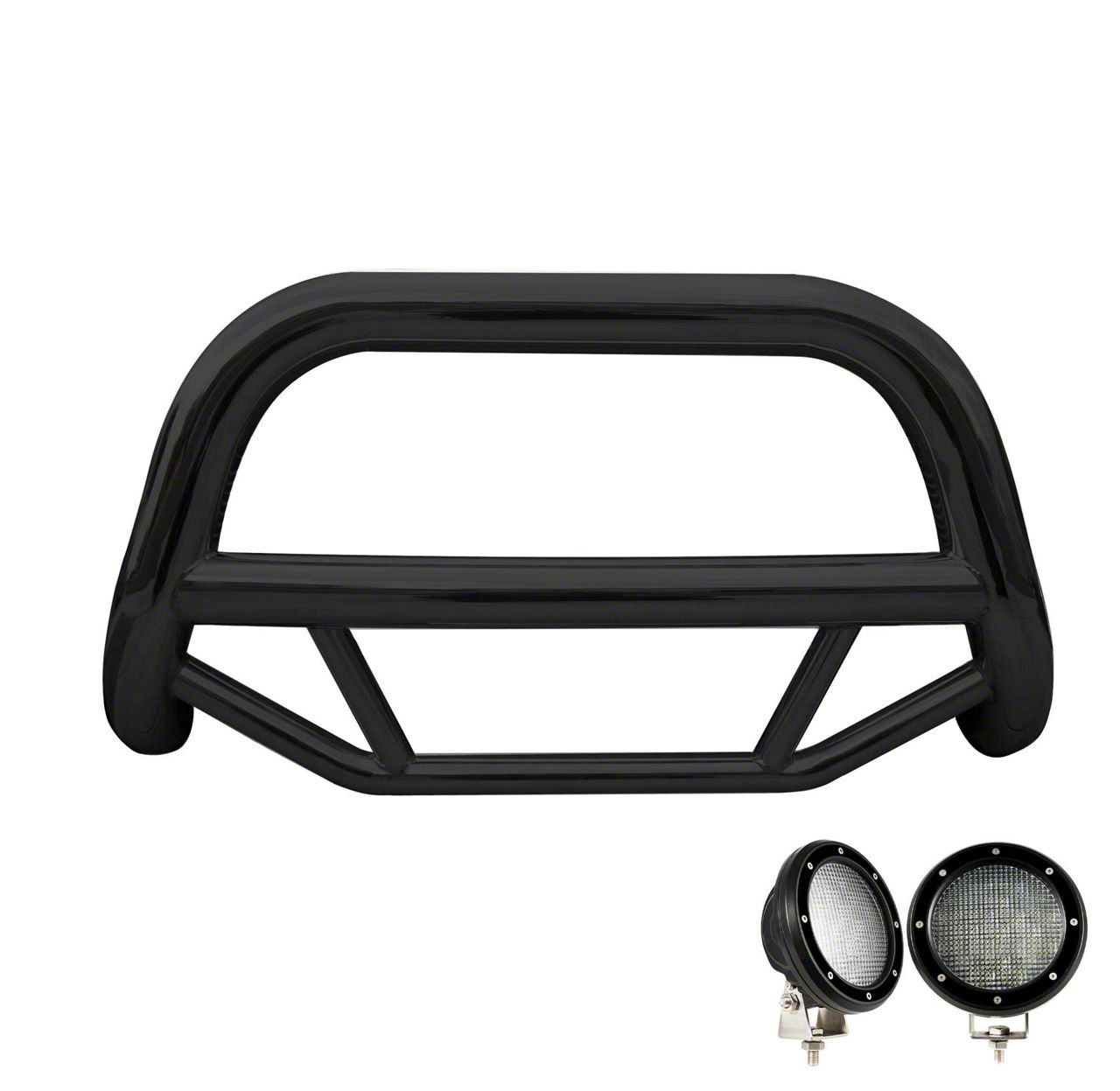 Black Horse Off Road Max Bull Bar Kit Black Steel No skid plate Pair of 5.3" Dia. LED Flood Lights w/ Black Trim Rings Wiring Harness and Switch