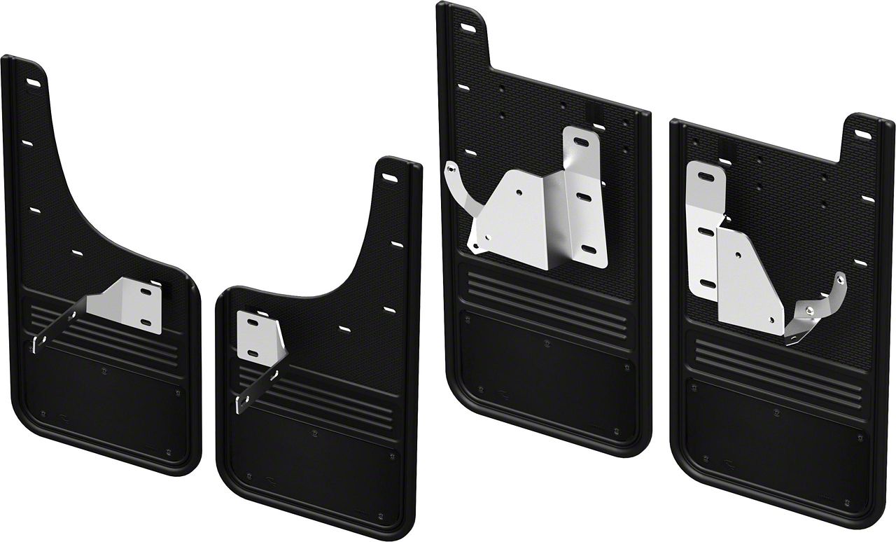 The Gatorback Mud Flap set with black anodized aluminum plates for the Ford F-250 Super Duty or F-350 Super Duty(single rear wheel) are designed for a perfect fit. These mud flaps will add a level of funtionality to your vehicle while also giving it a unique look. The 12" wide heavy rubber mud flaps will protect your vehicle from rocks, mud, gravel, snow and more. You will see your vehicle staying cleaner longer, less junk on your step bars, as well as fewer rock chips on the paint. The Gatorback series mud flaps are the industries highest quality, heavy duty mud guards! The rugged design and quality finish of these mud flaps make the perfect compliment to your truck. Featuring a 1/2" thick rubber flap, these mud flaps are sure to impress while they protect your investment.The black anodized aluminum plates measures 10 1/4" x 5" . You will appreciate the attention to detail in these flaps.Installation is made simple featuring no body drilling using factory exisiting fastereners and mounting locations. If there are not any fasteners the flaps will come with the needed hardware and brackets for solid installation. Ford Accesories also test fits the flaps on each model year vehicle ensuring the fitment of the product. Installation takes about 15 mins per flap and you can use tools you have at home. The Gatorbacks install flush to the inside of the wheel well so they work with step bars, power boards or side steps. The mudflaps also feature a lifetime warranty on the rubber portion of the flap. If the flap comes off the truck or is damaged to due to normal wear and tear, let us know and we will send you a replacement piece of rubber at no charge.Manufacturer Warranty-Gatorback mudflaps are backed by a Limited lifetime warranty. This warranty covers rubber replacement (ex- tear offs) for the lifetime of the product to the original owner. It does not cover damage caused by abuse, or regular wear and tear on brackets, plates, or mounting hardware.