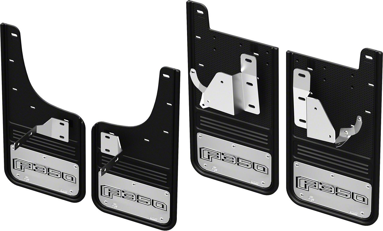 The F-350 logo Gatorback Mud Flap set for the Ford F-350 Super Duty(single rear wheel) are designed for a perfect fit. These mud flaps will add a level of funtionality to your vehicle while also giving it a unique look. The 12" wide heavy rubber mud flaps will protect your vehicle from rocks, mud, gravel, snow and more. You will see your vehicle staying cleaner longer, less junk on your step bars, as well as fewer rock chips on the paint. The Gatorback series mud flaps are the industries highest quality, heavy duty mud guards! The rugged design and quality finish of these mud flaps make the perfect compliment to your truck. Featuring a 1/2" thick rubber flap, these mud flaps are sure to impress while they protect your investment.The F-350 logo is officially licensed through Ford Accessories ensuring it looks perfect and is die stamped into the stainless steel plate with a hand applied vinyl overlay. The stainless plate is 10 1/4" x 5" . You will appreciate the attention to detail in these flaps.Installation is made simple featuring no body drilling using factory exisiting fastereners and mounting locations. If there are not any fasteners the flaps will come with the needed hardware and brackets for solid installation. Ford Accesories also test fits the flaps on each model year vehicle ensuring the fitment of the product. Installation takes about 15 mins per flap and you can use tools you have at home. The Gatorbacks install flush to the inside of the wheel well so they work with step bars, power boards or side steps. The mudflaps also feature a lifetime warranty on the rubber portion of the flap. If the flap comes off the truck or is damaged to due to normal wear and tear, let us know and we will send you a replacement piece of rubber at no charge.Manufacturer Warranty-Gatorback mudflaps are backed by a Limited lifetime warranty. This warranty covers rubber replacement (ex- tear offs) for the lifetime of the product to the original owner. It does not cover damage caused by abuse, or regular wear and tear on brackets, plates, or mounting hardware.