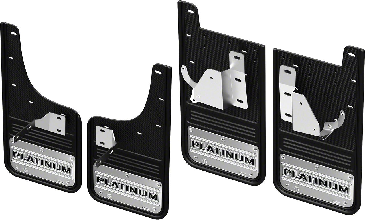 The Platinum logo Gatorback Mud Flap set for the Ford F-250 Super Duty or F-350 Super Duty(single rear wheel) are designed for a perfect fit. These mud flaps will add a level of funtionality to your vehicle while also giving it a unique look. The 12" wide heavy rubber mud flaps will protect your vehicle from rocks, mud, gravel, snow and more. You will see your vehicle staying cleaner longer, less junk on your step bars, as well as fewer rock chips on the paint. The Gatorback series mud flaps are the industries highest quality, heavy duty mud guards! The rugged design and quality finish of these mud flaps make the perfect compliment to your truck. Featuring a 1/2" thick rubber flap, these mud flaps are sure to impress while they protect your investment.The Platinum logo is officially licensed through Ford Accessories ensuring it looks perfect and is die stamped into the stainless steel plate with a hand applied vinyl overlay. The stainless plate is 10 1/4" x 5" . You will appreciate the attention to detail in these flaps.Installation is made simple featuring no body drilling using factory exisiting fastereners and mounting locations. If there are not any fasteners the flaps will come with the needed hardware and brackets for solid installation. Ford Accesories also test fits the flaps on each model year vehicle ensuring the fitment of the product. Installation takes about 15 mins per flap and you can use tools you have at home. The Gatorbacks install flush to the inside of the wheel well so they work with step bars, power boards or side steps. The mudflaps also feature a lifetime warranty on the rubber portion of the flap. If the flap comes off the truck or is damaged to due to normal wear and tear, let us know and we will send you a replacement piece of rubber at no charge.Manufacturer Warranty-Gatorback mudflaps are backed by a Limited lifetime warranty. This warranty covers rubber replacement (ex- tear offs) for the lifetime of the product to the original owner. It does not cover damage caused by abuse, or regular wear and tear on brackets, plates, or mounting hardware.