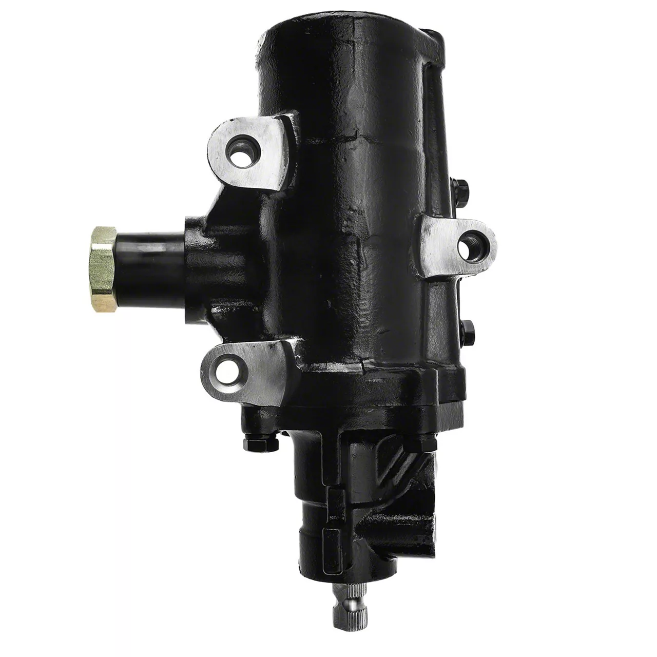 Construction and Appearance. Built from a combination of steel and aluminum materials, this steering gear box features a matte black finish that offers corrosion resistance and a clean look inside the engine bay. Its construction includes sector teeth, a rocker shaft, and steel balls, all contributing to durable long-term function. The assembly is designed for direct replacement and features three mounting holes to ensure secure attachment and consistent operation through years of use.
