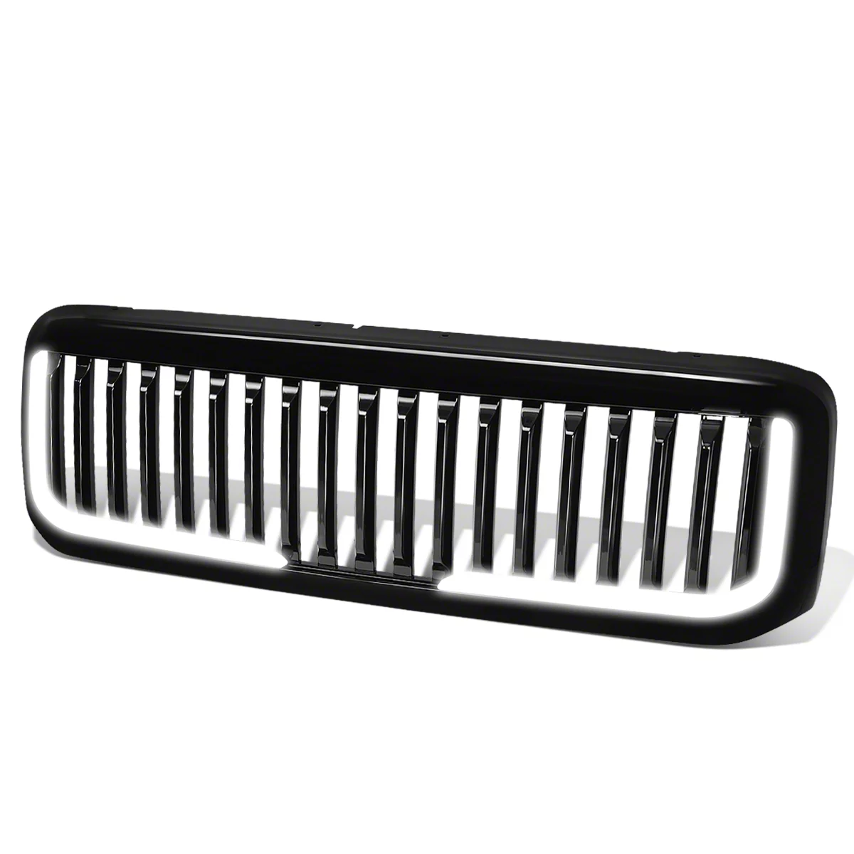 Application. This Vertical Fence Style Upper Replacement Grille with LED DRL Light fits 1999–2004 Ford F‑250 Super Duty models.