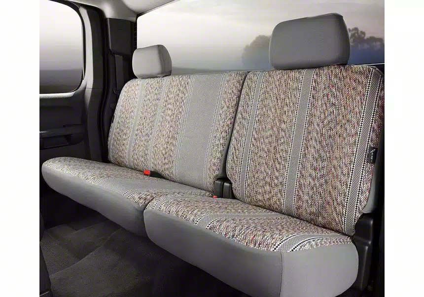 Stylish Rear Seat Protection. The Fia Wrangler Series Seat Cover brings rugged character and classic styling to your truck’s rear seating area while delivering long-lasting protection. Designed to defend your factory upholstery from wear, spills, and daily use, this cover offers a unique western-inspired look with a matte gray finish and authentic woven saddle blanket material. It’s a perfect combination of tradition and durability for any truck interior.