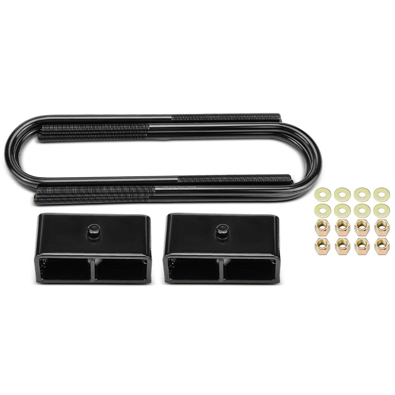 Construction and Appearance. Crafted for durability, this kit includes high-quality lift blocks and U-bolts to ensure stable and secure lifting. The components are designed to handle heavy loads, while the hardware provides a direct fit for reliable installation.