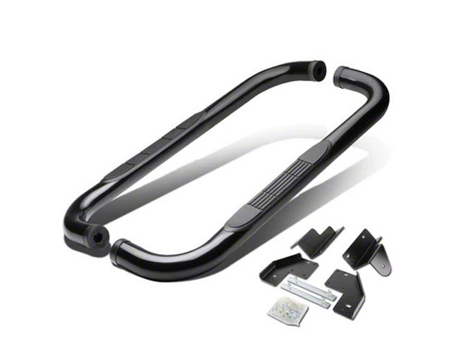 Construction and Appearance. Built from heavy-duty steel tubing, these 3-inch round step bars are engineered for strength and durability under daily use. The black powder-coated finish offers corrosion resistance and a rugged aesthetic that complements any body color. The step pads are integrated into the design to provide sure footing in all weather conditions.