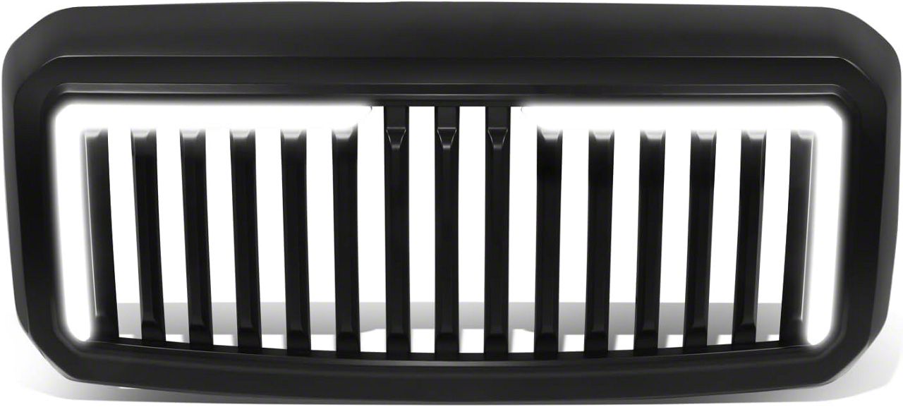 Reinforced ABS Material for Strength and Longevity of UseFull Front Grille Frame, Badgeless Vertical Slat Design, L-Pattern White LED BarIncludes 1 x Front Grille, 1 X Wiring Harness; Matte Black Finish for Striking LooksPrecise Fitment/ OE Replacement