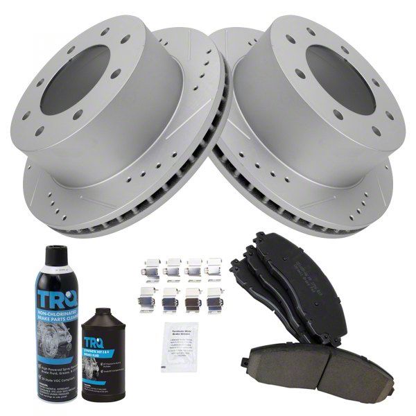 Performance Ceramic Front Brake Kit (BKA21531) by TRQ®. Upgrade the performance of your steel stallion and enjoy every mile of your trip safely and confidently by upgrading your old, factory brake parts with this TRQ ceramic brake kit. Engineered for peace of mind, this kit includes perfectly matched components that offer trouble-free installation, saving you time and money. Made from premium-grade materials in state-of-the-art facilities, TRQ ceramic brake parts deliver better stopping power, ensure longer life, and create less dust.
