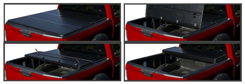Hard Tri-Fold Tonneau Cover. This tonneau cover features a tri-fold design. Its panels are divided into three sections, allowing you to easily access your truck bed in any way you want.