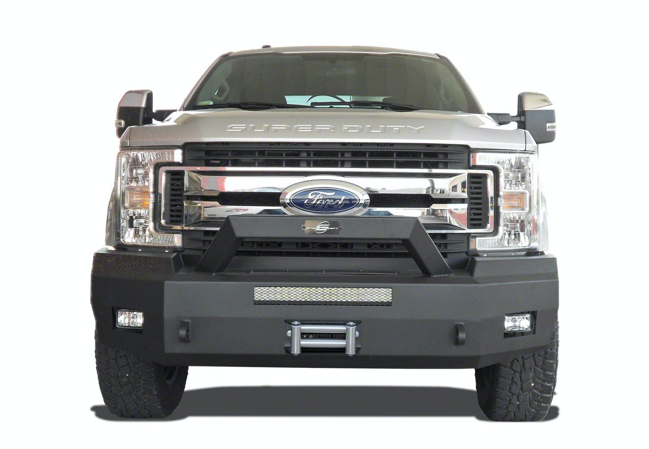 Protection and Style. Add spectacular protection to your front end with this Elevation Bullnose Front Bumper. This bumper is strong, but lightweight, and looks beautiful in the front of your Super Duty. There is lighting options and winch options as well.