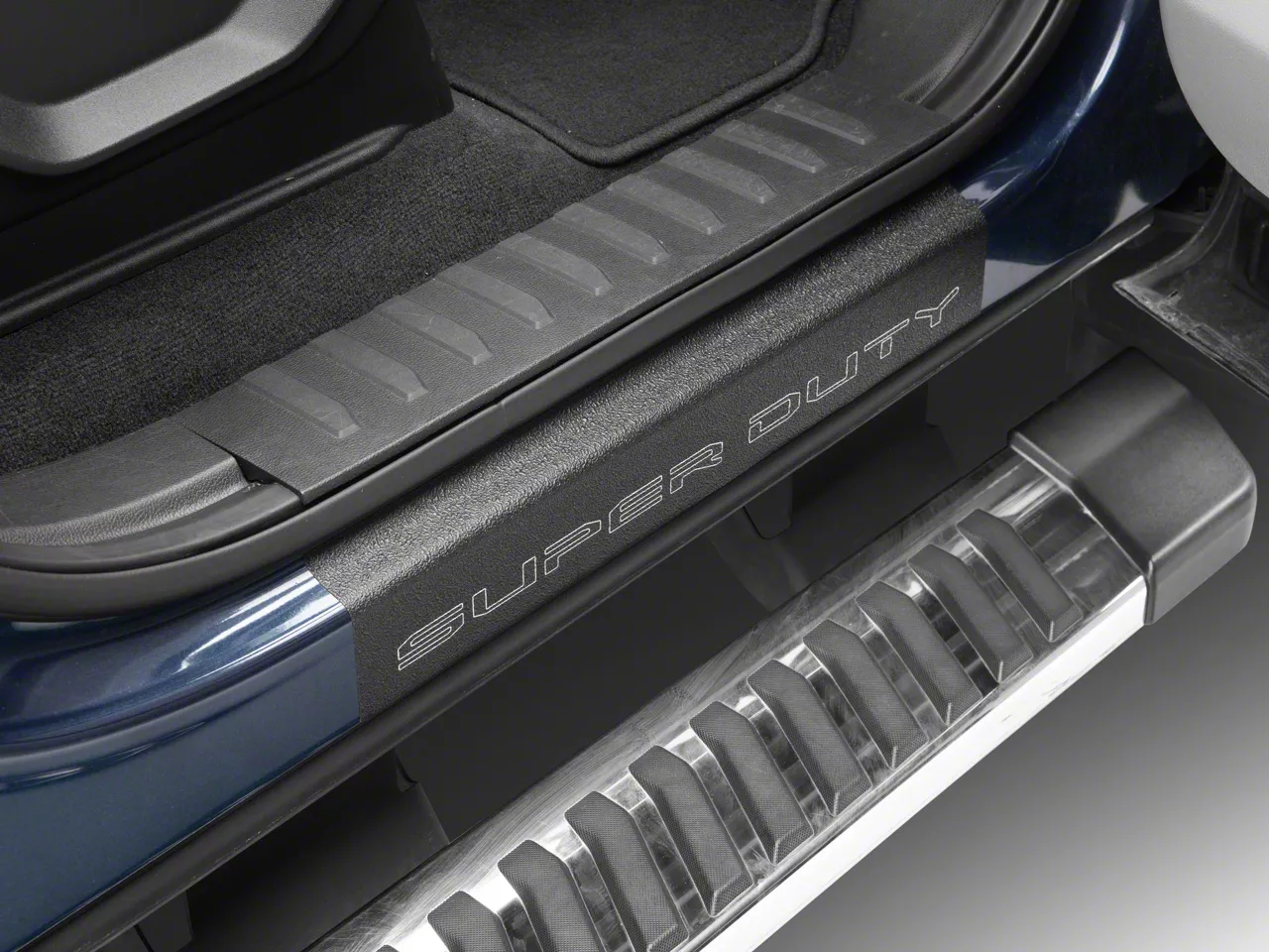 Door Sill Protectors. Add a more expensive, upscale appearance to your Super Duty's interior with a set of Front Door Sill Protectors that promote the Super Duty logo. These Tuf-Liner Series Door Sill Protectors feature a similar look to spray in bed-liner and will protect your F-350's sills from scratches, dirt, rocks, and chipping paint. These Door Sill Protectors are an affordable and simple way to personalize your Ford Super Duty.