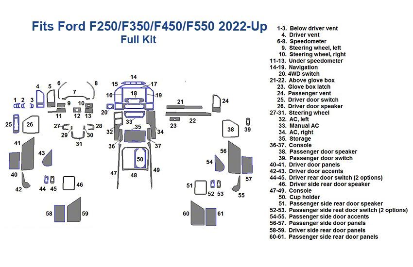 Application. The Full Dash Trim Kit fits 2022-2026 F-350 Super Duty models.