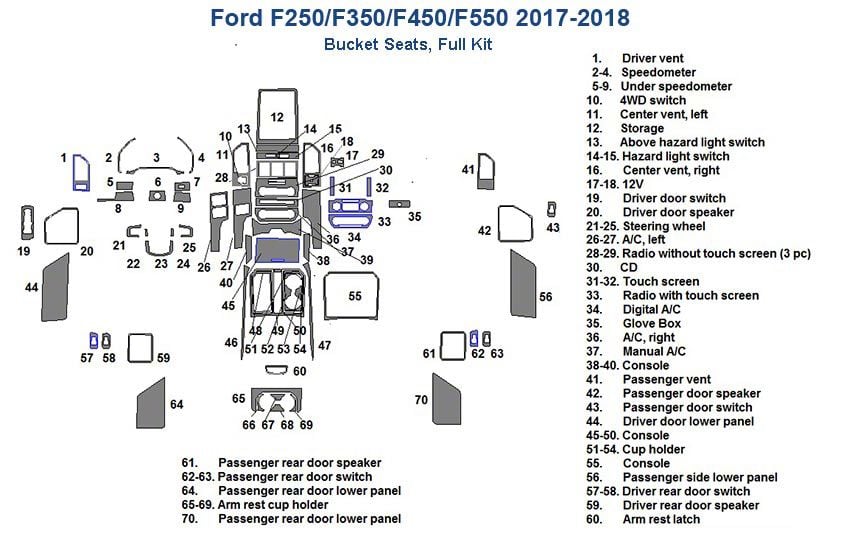 Application. This Full Dash Trim Kit fits all 2017-2018 Ford F-350 Super Duty models with Bucket Seats.