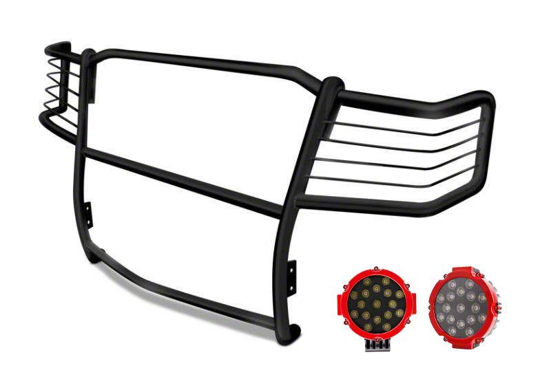 Black Horse Off Road Grille Guard Kit Black Steel Modular Incl. pair of 7.0"Dia. LED Lights w/Red Trim Rings w/ Wiring Harness and Switch