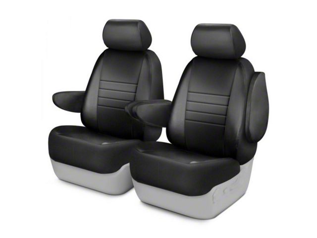 Snug Fit and Durable. The LeatherLite Series Front Seat Covers in Black is designed to enhance the comfort, protection, and style of your vehicle's front seats. This pair of seat covers features a Form-Fit Wrap-Around Design that provides a snug and tailored fit. This ensures a sleek appearance that complements your interior. In addition to covering the front seats, this set includes Custom Console and Headrest Covers, ensuring a cohesive and coordinated look throughout your vehicle's interior. The Super-Grip Slip-Resistant Fastening System keeps the covers securely in place, preventing shifting or sliding during use.