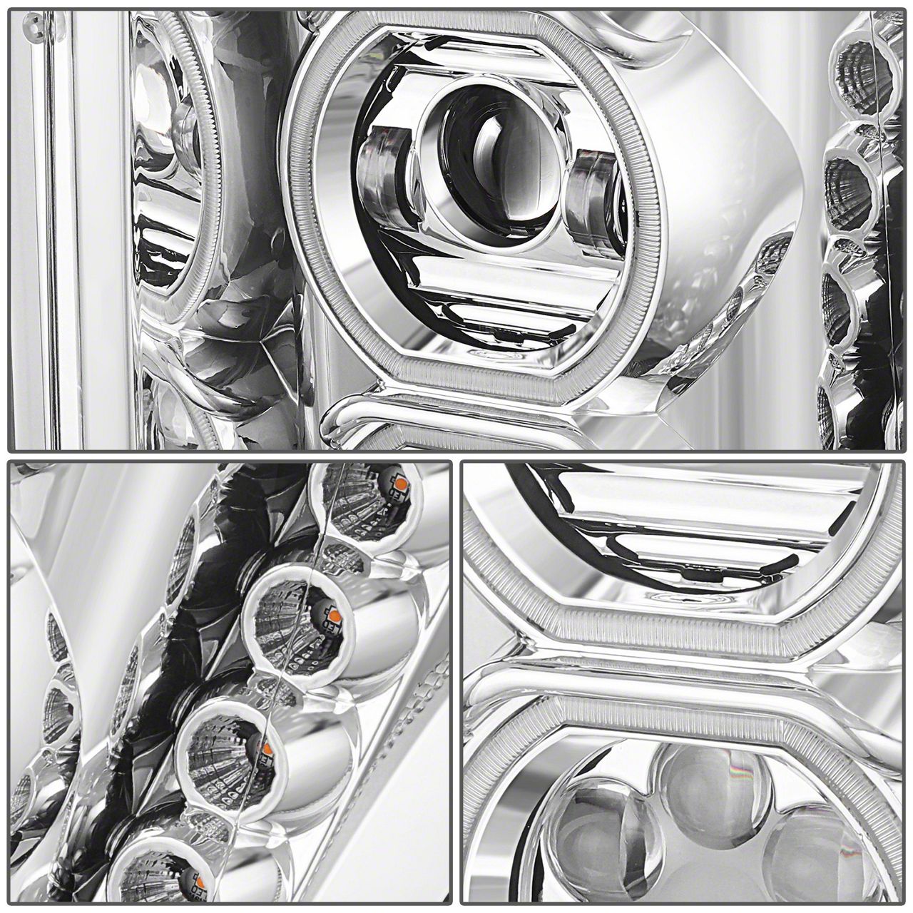 Mirror-Finish Chrome Housing That Commands Attention. The LED DRL Halo Projector Headlights' chrome housing enhances the vehicle’s front-end appearance with a refined shine that pairs seamlessly with both factory and aftermarket styling. Its polished finish delivers a bold yet professional look, instantly updating the F-350’s exterior.