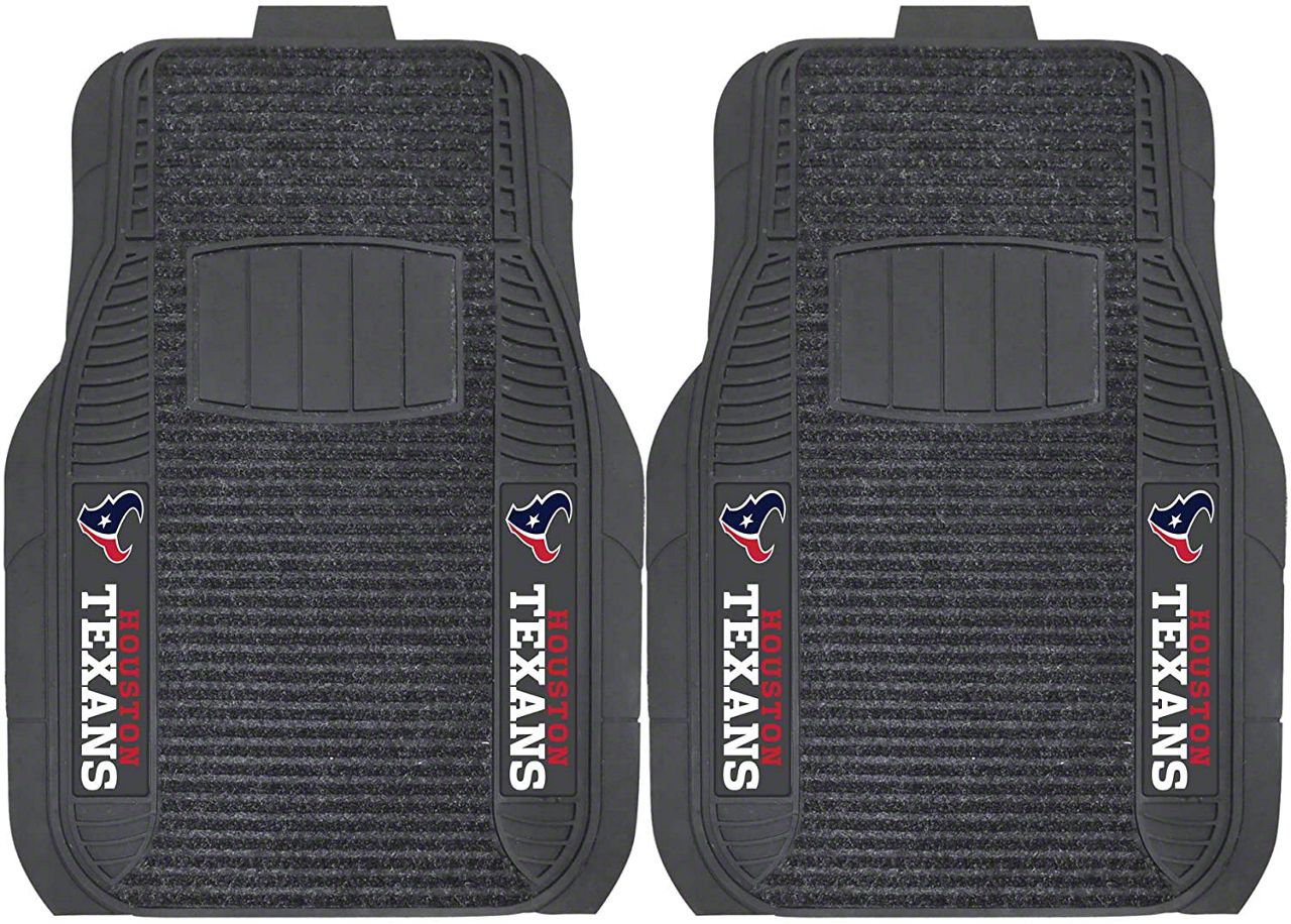 Application. These Molded Front Floor Mats with officially-licensed Houston Texans logo feature a universal design so they will fit most makes and models of vehicles. These Mats can be trimmed to fit if necessary. Sold as a set of two Front Mats.