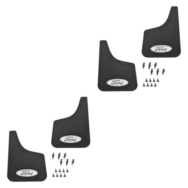 Comprehensive Protection. Protect and enhance the appearance of your F-350 with these Mud Flaps; Front and Rear. These mud flaps are expertly designed to offer superior protection against road debris and mud, keeping your truck clean and maintaining its pristine condition. Made from high-grade, robust materials, these mud flaps are built to last. They withstand harsh weather conditions and the rigors of off-road driving, ensuring durability and long-term performance.
