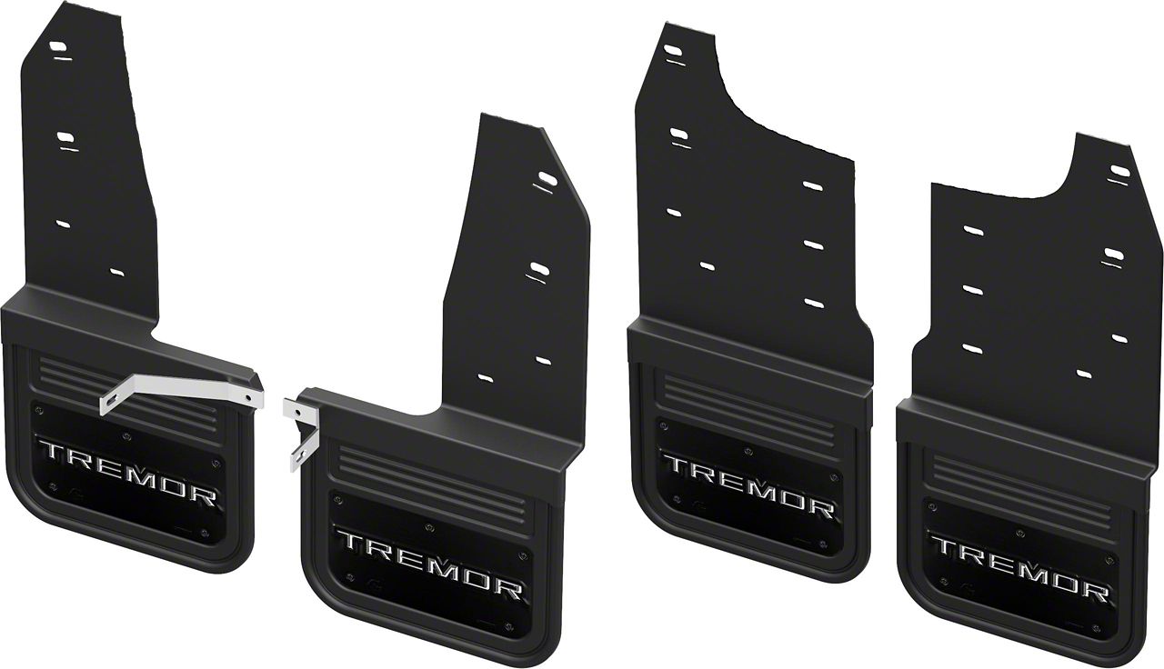 No-Drill Mud Flaps with Black Anodized Gray Tremor Logo; Front and Rear (23-26 F-350 Super Duty)