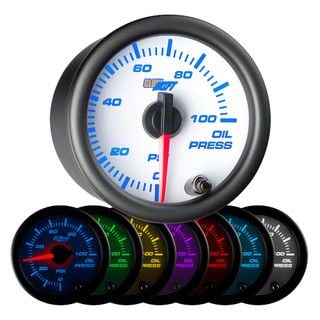 Engine Monitoring. The Oil Pressure Gauge with a White 7 Color display provides accurate and reliable readings of your vehicle's oil pressure. This universal fit gauge is designed to enhance engine monitoring, helping you keep track of your engine's health and performance. The white face and 7 color LED display offer clear visibility, allowing you to customize the display to match your vehicle's interior or personal preference.