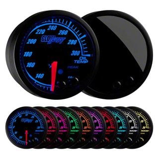 This 2 1/16" (52mm) oil temperature gauge outperforms competition with features that include a peak recall function, programmable high and low warning functions, stepper motor technology, 10 color through dial LED lighting, as well as a self-calibration mode at startup, an illuminated red needle, and a low profile magnified tinted lens. The adjustable high and low warning functions will alert you visually or with an optional audible tone, ensuring your vehicle’s oil temp is not running too hot, and the peak recall feature gives you an instant assessment of your vehicle. The included stepper motor technology ensures all needle movement is remarkably smooth and all gauge readings exceptionally accurate. GlowShift’s 10 color through dial lighting lets you match your stock gauges or add a custom look to interior of your vehicle, and with the color recall feature you won’t have to worry about resetting the gauge to your preferred color every time you turn your vehicle on. This oil temperature gauge will dim 30% when connected to your factory headlight switch, making it much easier to read when driving at night.