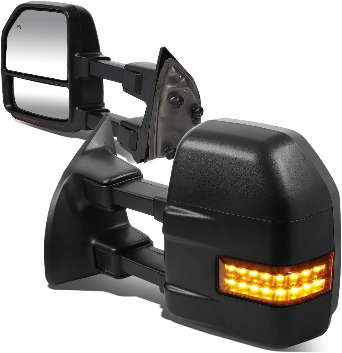 Reliable Mirror Upgrade. The Powered Heated Towing Mirrors with Amber LED Signals are built to enhance safety and visibility for your towing needs. These mirrors are perfect for replacing factory units that no longer perform as needed. With integrated heating and amber LED signal lights, they provide essential features that improve your driving awareness and confidence while hauling trailers or large loads.