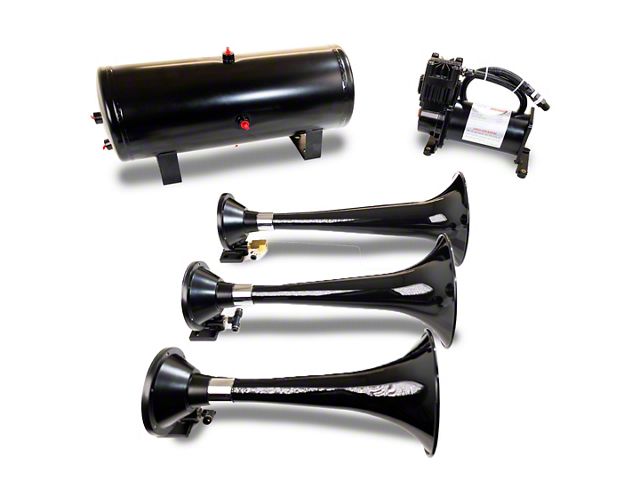Powerful Road Presence. Revolutionize your vehicle's presence with the ProBlaster ABS Triple Train Horn System; Black. Featuring three robust horns, this system is engineered to produce high-decibel blasts that replicate the powerful sound of a train. This system is built to withstand various weather conditions, maintaining its integrity and performance.