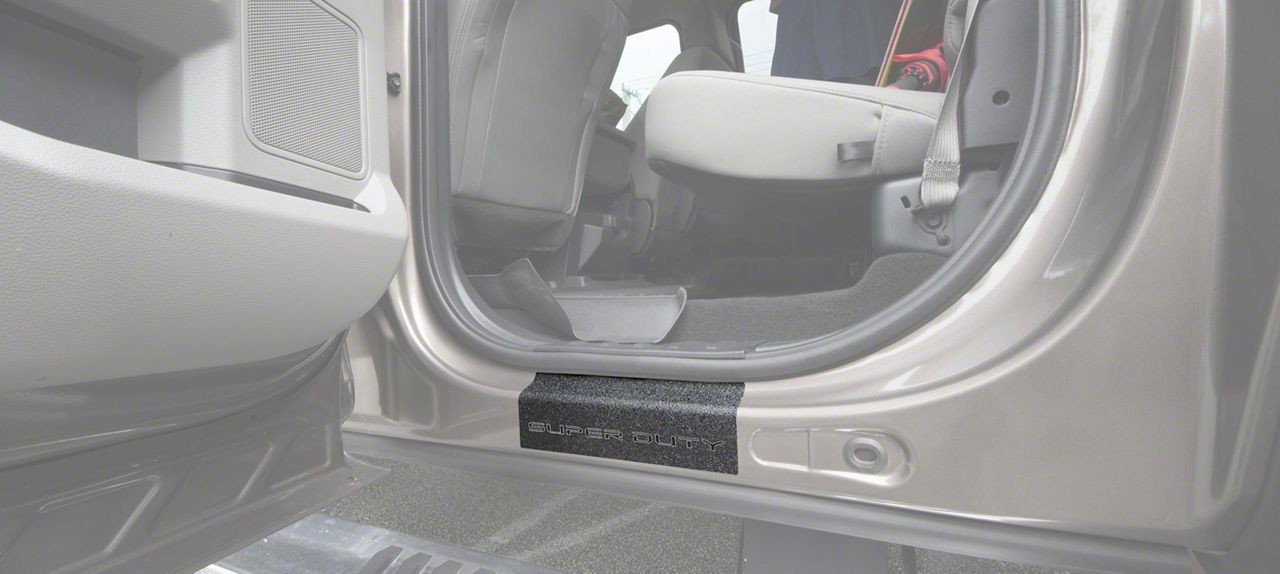 Rear Door Sill Protectors. Add a more expensive, upscale appearance to your Super Duty's interior with a set of Rear Door Sill Protectors that promote the Super Duty logo. These Tuf-Liner Series Door Sill Protectors feature a similar look to spray in bed-liner and will protect your F-350's sills from scratches, dirt, rocks, and chipping paint. These Door Sill Protectors are an affordable and simple way to personalize your SuperCrew F-350 Super Duty.