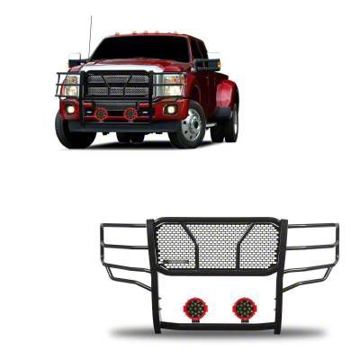 Application. The Rugged Heavy Duty Grille Guard with 7-Inch Red Round Flood LED Lights fits 2011-2016 F-350 Super Duty models.
