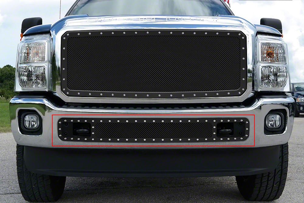 Aggressive Styling. A Stainless Steel Rivet Lower Grille Insert is an excellent way to add a more aggressive appearance to your F-350. With a mesh grille design and accent rivets, this black Grille Insert will set your personal F-350 apart from all the rest. This Grille is an insert that simply attaches over your Super Duty's stock lower grille.