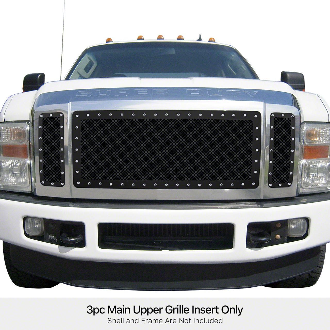 Application. This Wire Mesh Rivet Style Upper Replacement Grille fits 2008-2010 Ford F-350 Super Duty King Ranch, Lariat, and XLT models.