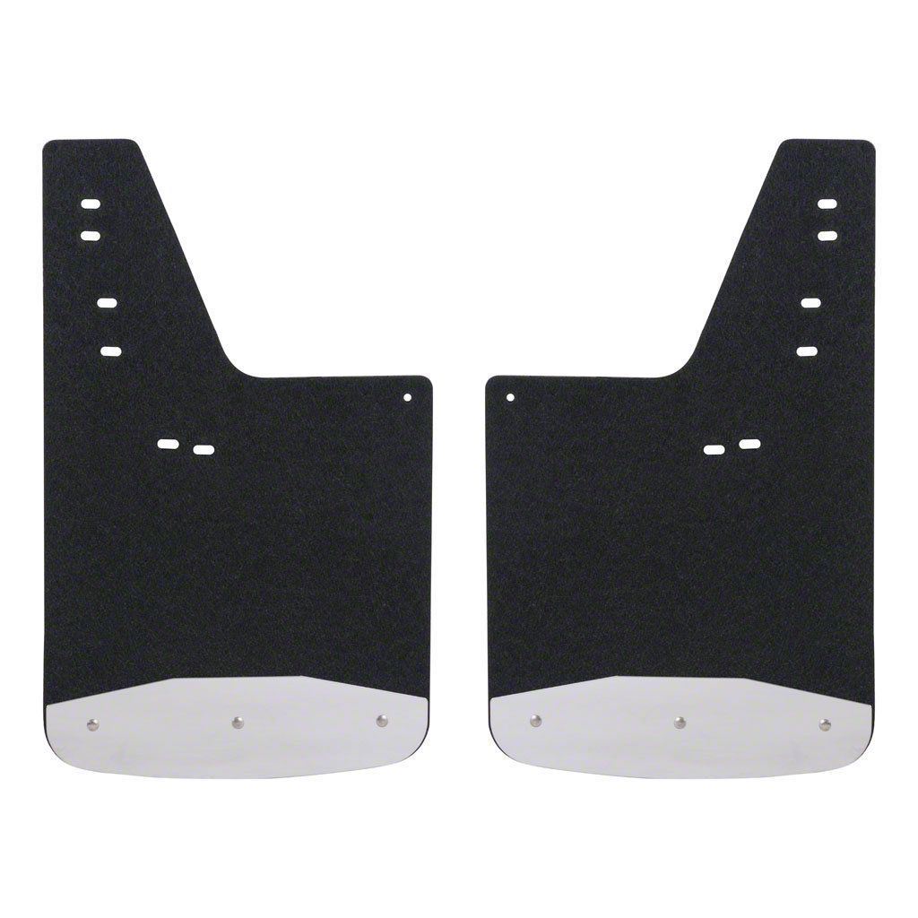 Construction. This pair of Textured Rubber Front or Rear Mud Guards are made of 3/8-inch thick recycled rubber flaps, which offer some flex, but also ward off scrapes. The textured rubber surface keeps up a clean appearance. There are high-polish, 18-gauge stainless steel plates and high-strength steel brackets round off the beauty of the guards